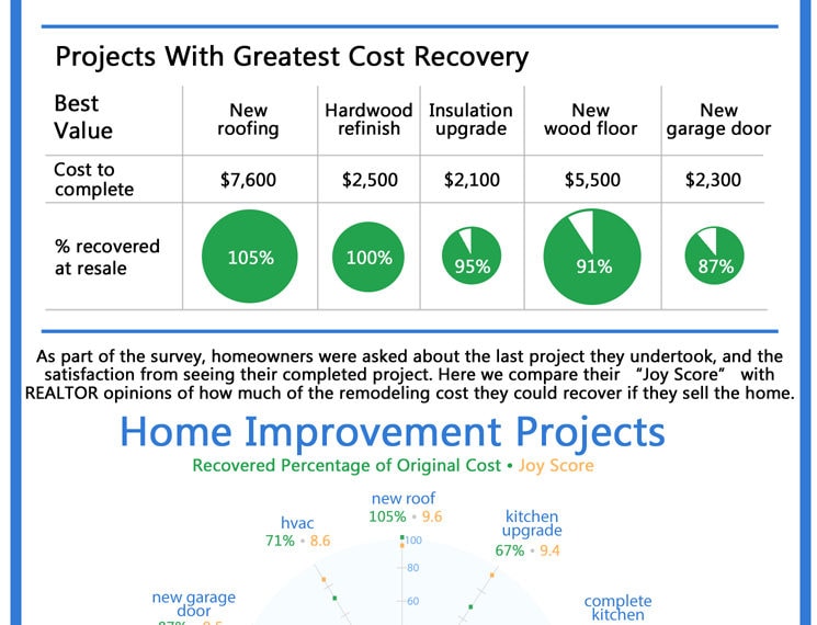 This is one of my favorite infographics that I share with people when they ask which parts of their home they should remodel. Not only does this show the return of investment when selling the home, but it also shows the amount of joy each owner got out of the remodel. Take a look, it’s pretty interesting information!